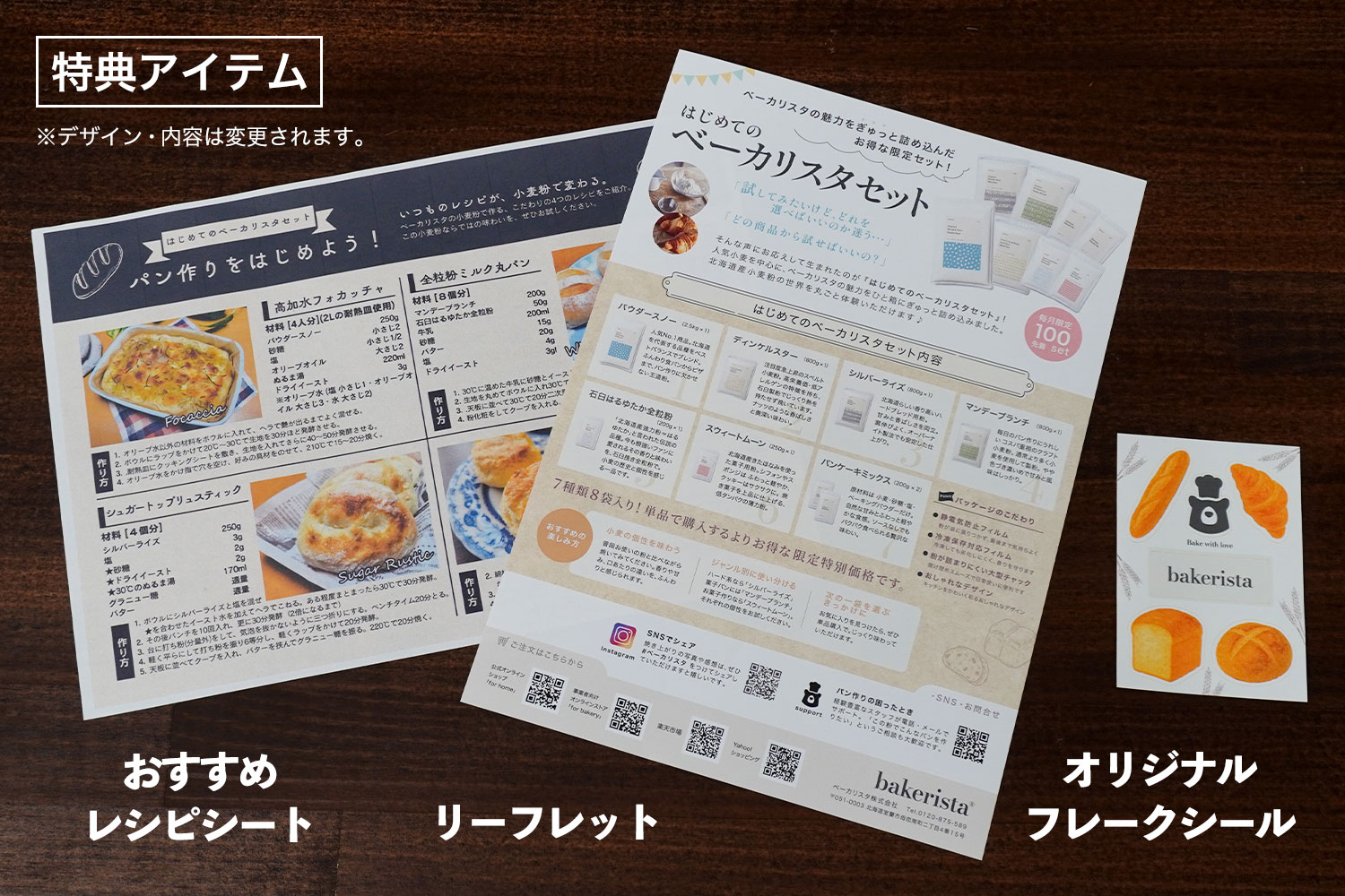 - セットの小麦粉を使ったおすすめレシピシートや、小麦粉の特徴をわかりやすくまとめたリーフレット、さらにベーカリスタオリジナルのフレークシールを同梱しています。(※デザイン・内容は予告なく変更となる場合がございます)