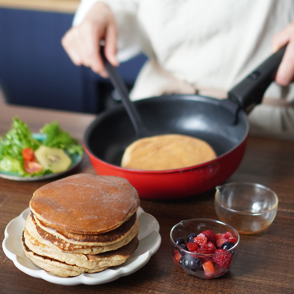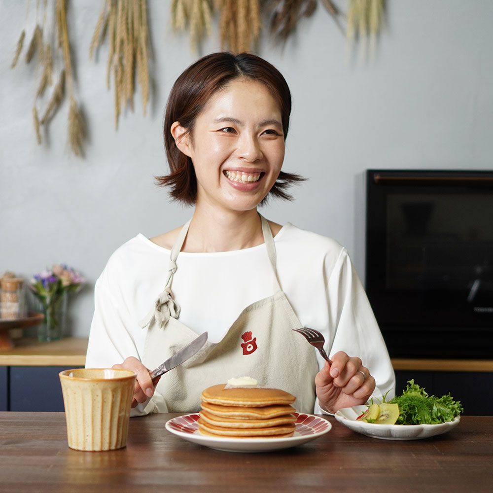- 原材料は、北海道産全粒粉・砂糖・塩・アルミフリーベーキングパウダー。シンプルだからこそ、小麦の風味が際立ちます。砂糖は控えめに仕上げているので、メープルシロップやバターのトッピングはもちろん、ベーコンや玉子をのせて“お食事パンケーキ”にもぴったりです。