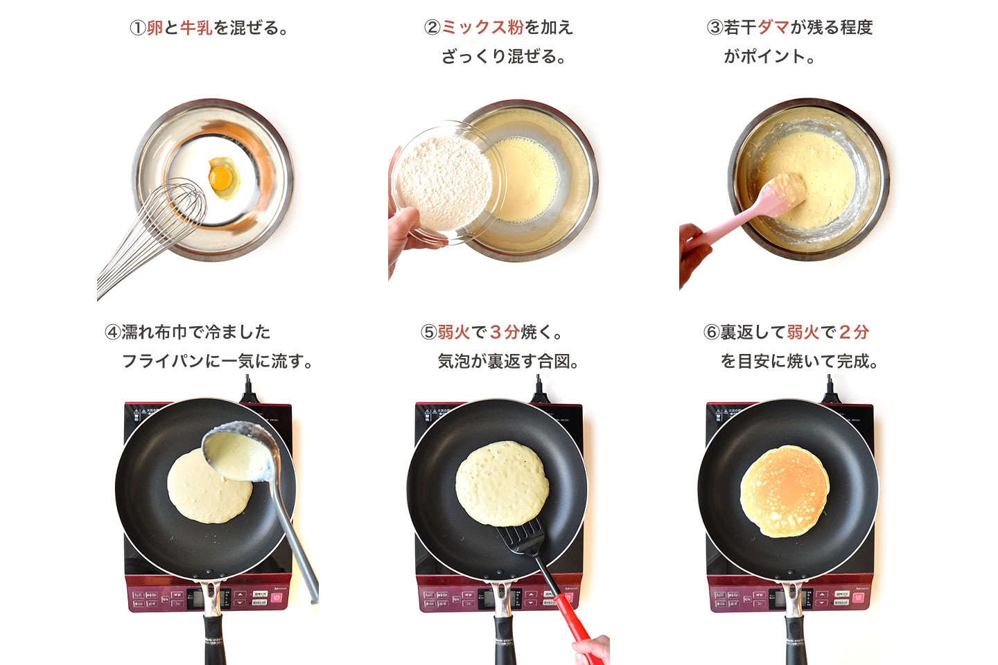 - 卵と牛乳、ミックス粉を、若干ダマが残る程度にざっくり混ぜる。高い位置からフライパンに一気に流し込むのがポイント。気泡が出てきたのを合図に裏返して焼いて完成です。ミックス粉200gで約4枚の目安です。