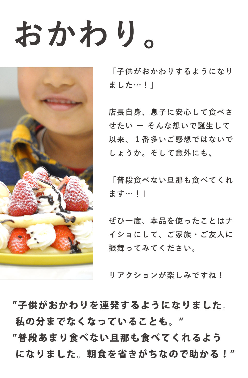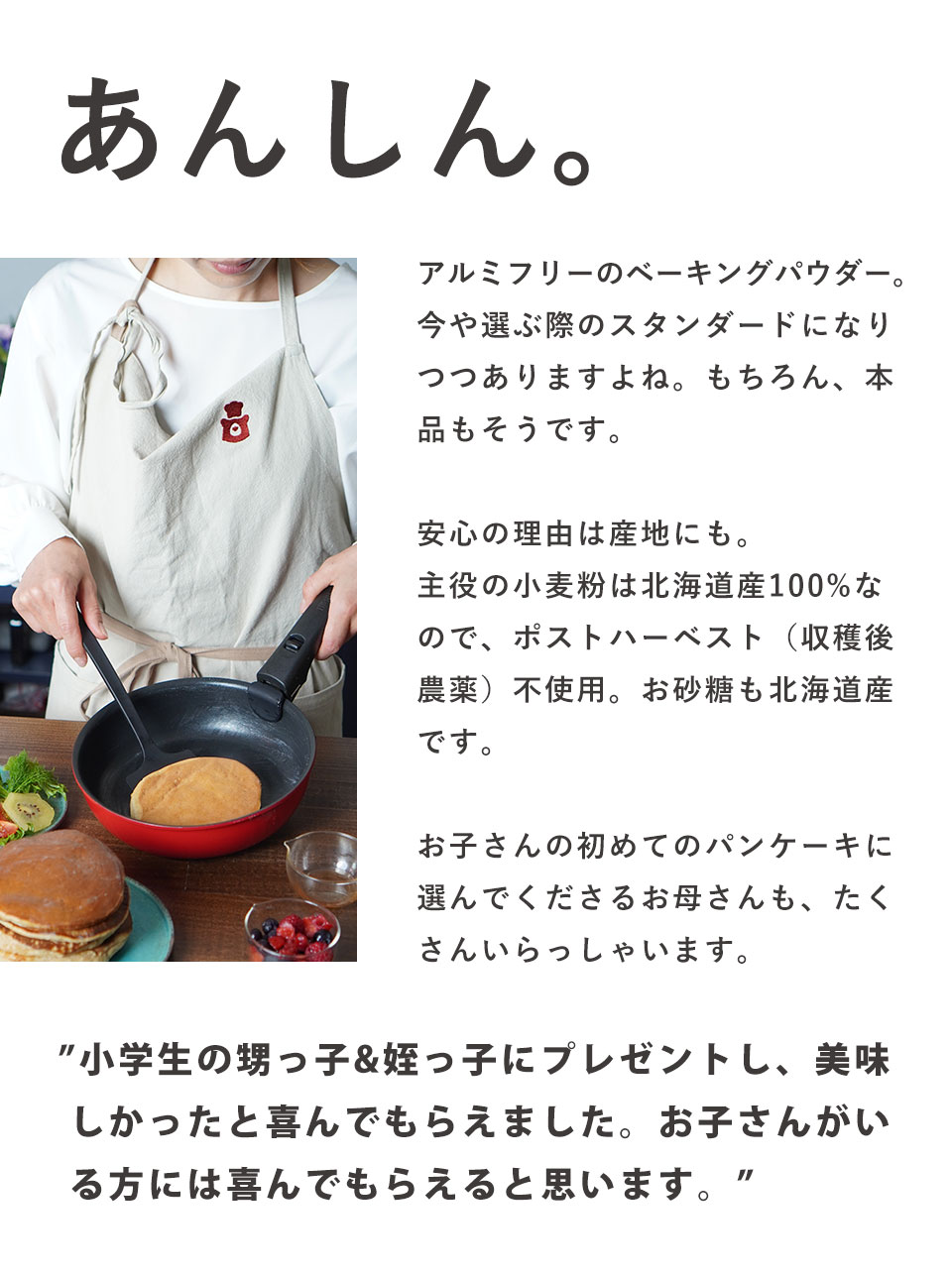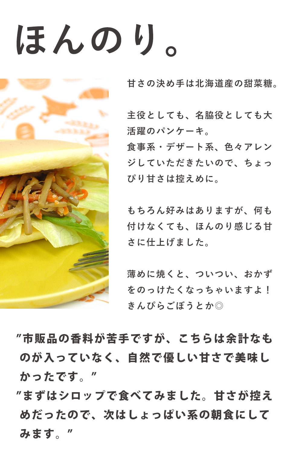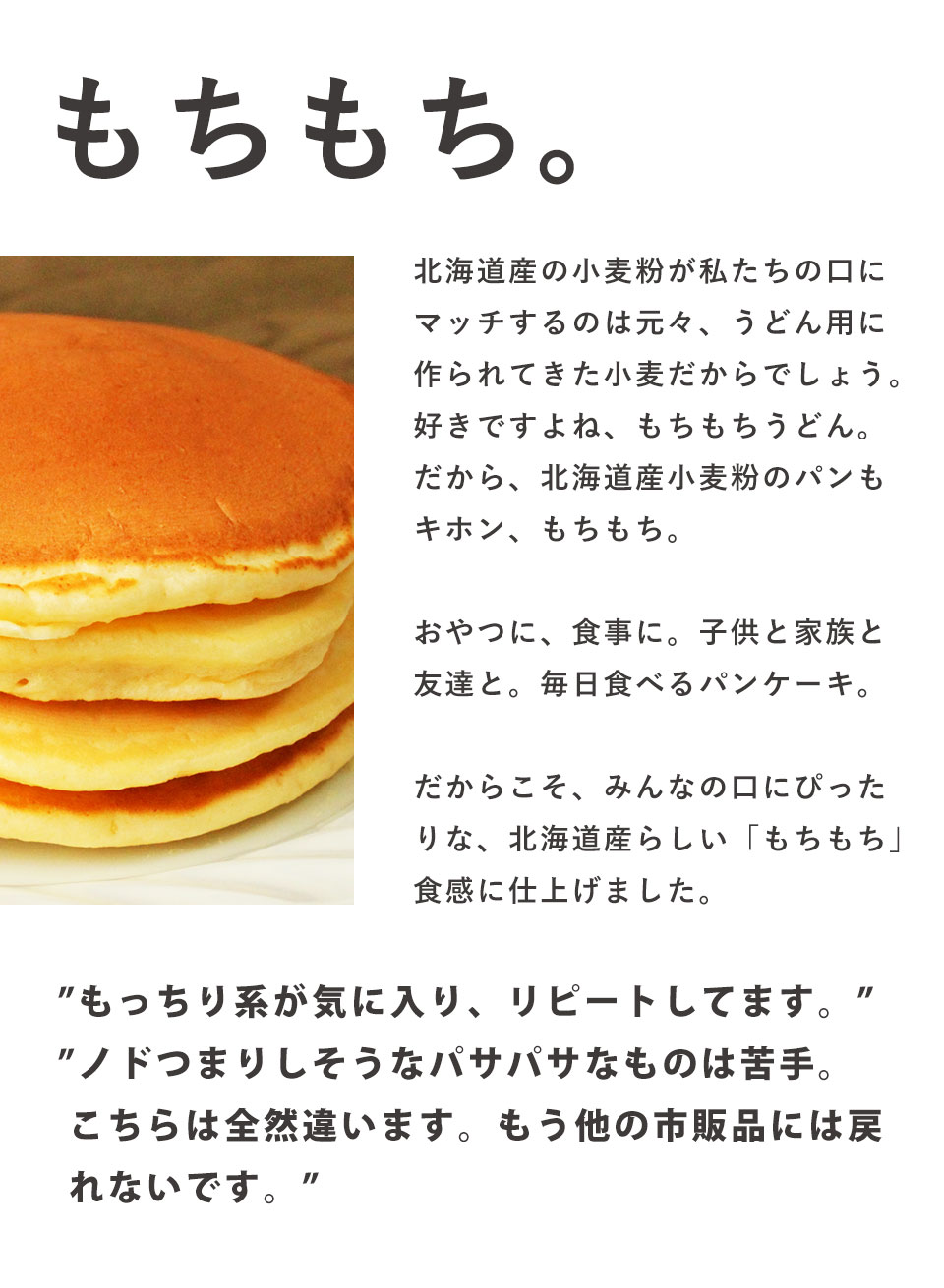 北海道の小麦粉と砂糖を使用し、素材にこだわったパンケーキミックスです。ふんわりとした口当たりと、口の中で溶けるような食感が特徴で、北海道小麦ならではのしっとり感もお楽しみいただけます。