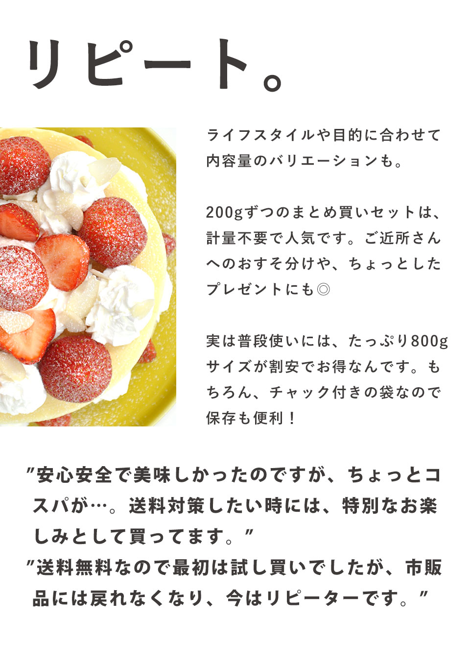 小麦粉(北海道産)、砂糖、ベーキングパウダー(アルミフリー)、食塩